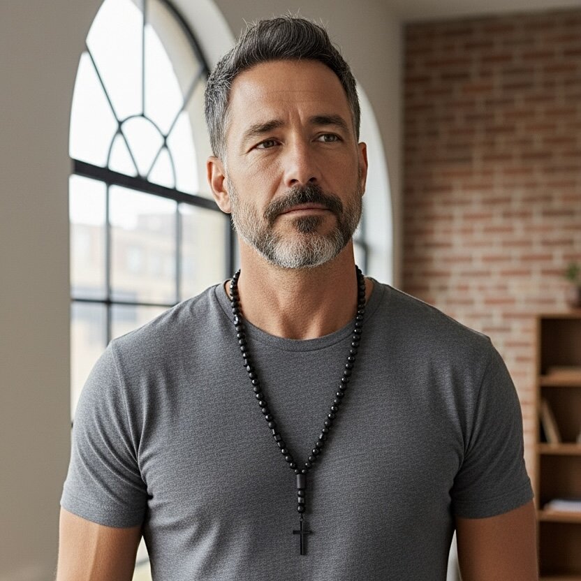 Šperk, ktorý vďaka svojmu zloženiu a krásnemu prevedeniu určite poteší každého milovníka náhrdelníkov. Náhrdelník v tvare ruženca je vyrobený z prírodných kameňov čierneho lesklého a matného onyxu, brúsených čiernych kameňov doplnený o znamenie zverokruhu, ktoré si viete zvoliť v náhrdelníku podľa seba. Celková dlžka náhrdelníka je 78cm. Všetky použité kamene sú vo veľkosti 8mm.