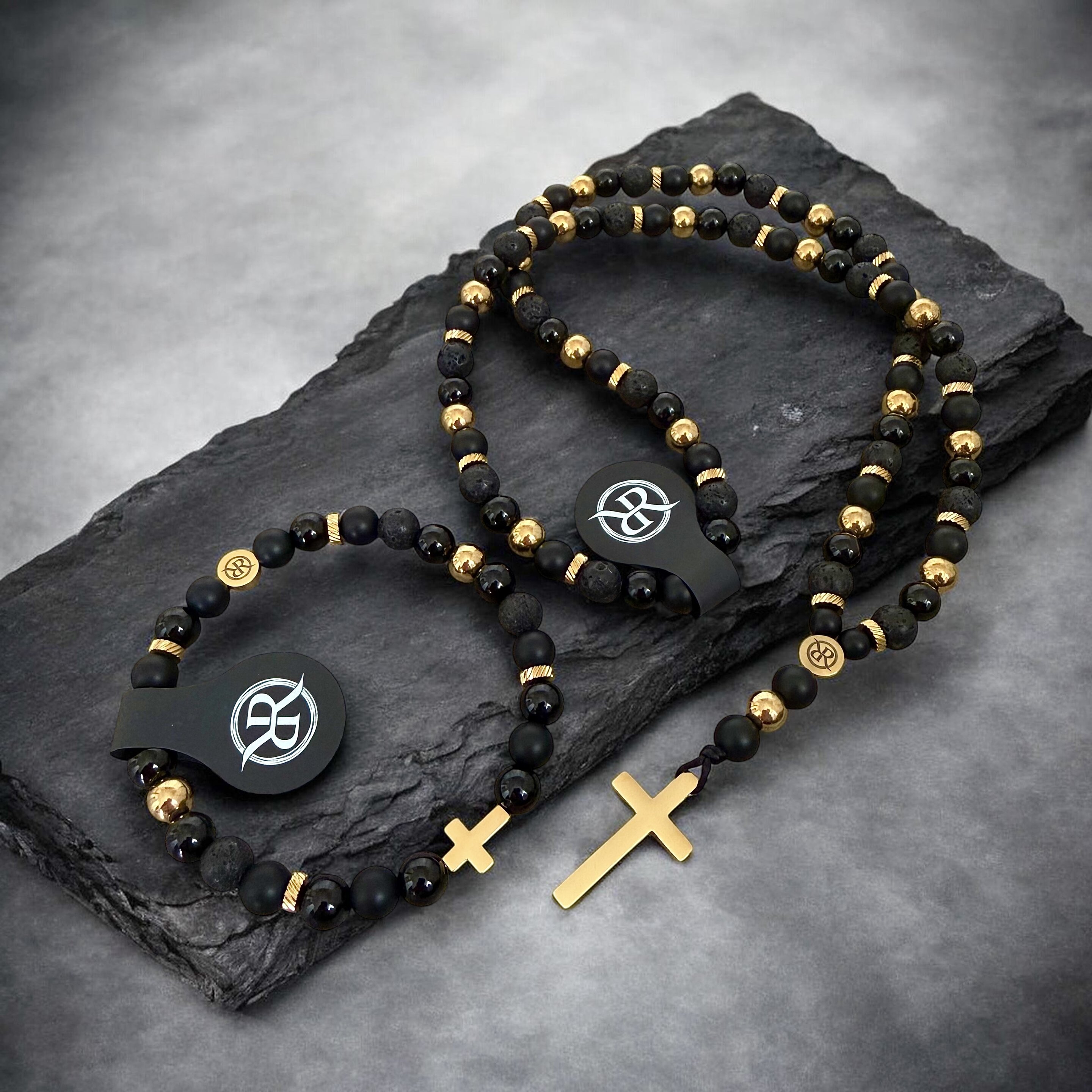 Ručne vyrobený náhrdelník Trinity v tvare ruženca z prírodných kameňov matného a lesklého onyxu, lávových kameňov so zlatými prvkami a zlatým krížikom ktorý symbolizuje silu, stabilitu, vieru a ochranu. Kombinácia čiernych kameňov a zlatých prvkov vytvára elegantný a nadčasový dizajn. Tento náhrdelník s náramkom nie je len doplnok, je to vyjadrenie vášho štýlu a sily ✨