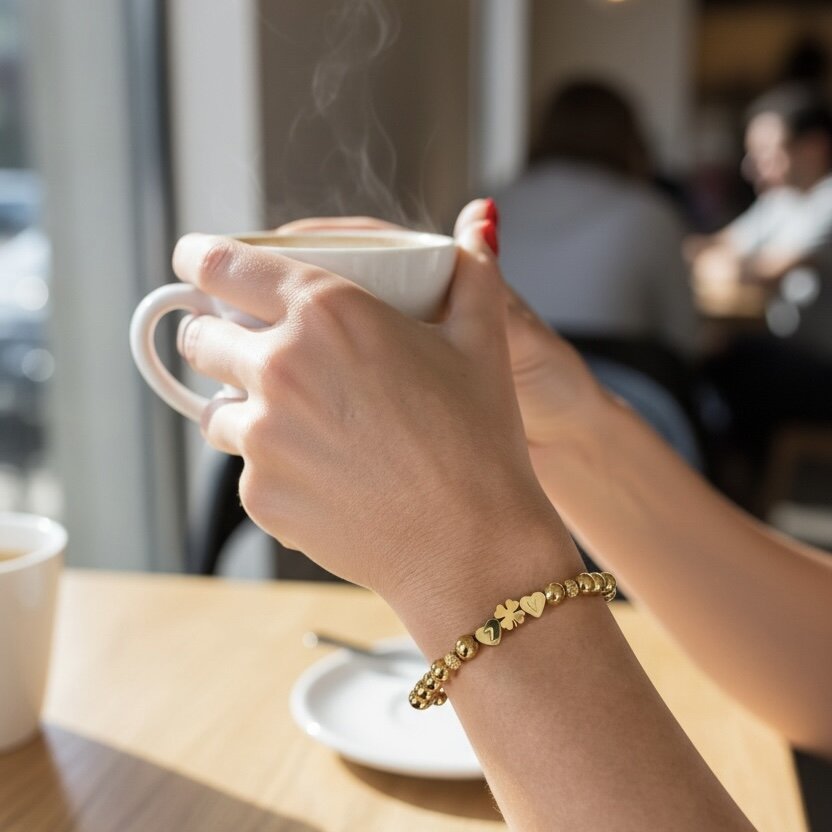 Dominantným prvkom sú srdiečka s vygravírovanými písmenami a štvorlístok pre šťastie v zlatom prevedení, ktorý symbolizuje šťastie a ochranu.Celkový dizajn pôsobí harmonicky, luxusne a nadčasovo, vďaka čomu je náramok ideálny na každodenné nosenie, ale aj výnimočné príležitosti.