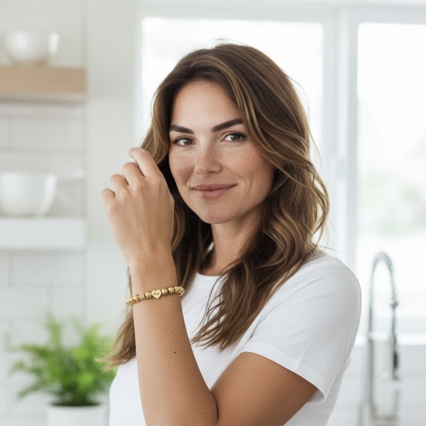 Dámsky náramok so srdiečkom s gravírom Mama. Luxusný náramok vyrobený z menších 6 mm zlatých kameňov, ktorý zaujme svojím elegantným vzhľadom a precíznym spracovaním. Dokonalo sa dá zladiť a vrstviť s inýmími náramkami, ktoré už máte a nosíte na ruke. Náramok je doplnený o zlaté vrúbkované prstence s povrchovou úpravou gold filled, vďaka čomu sú kamene a prstence odolné, nestratia farbu a náramok v tomto zložení je vhodný aj pre alergikov.