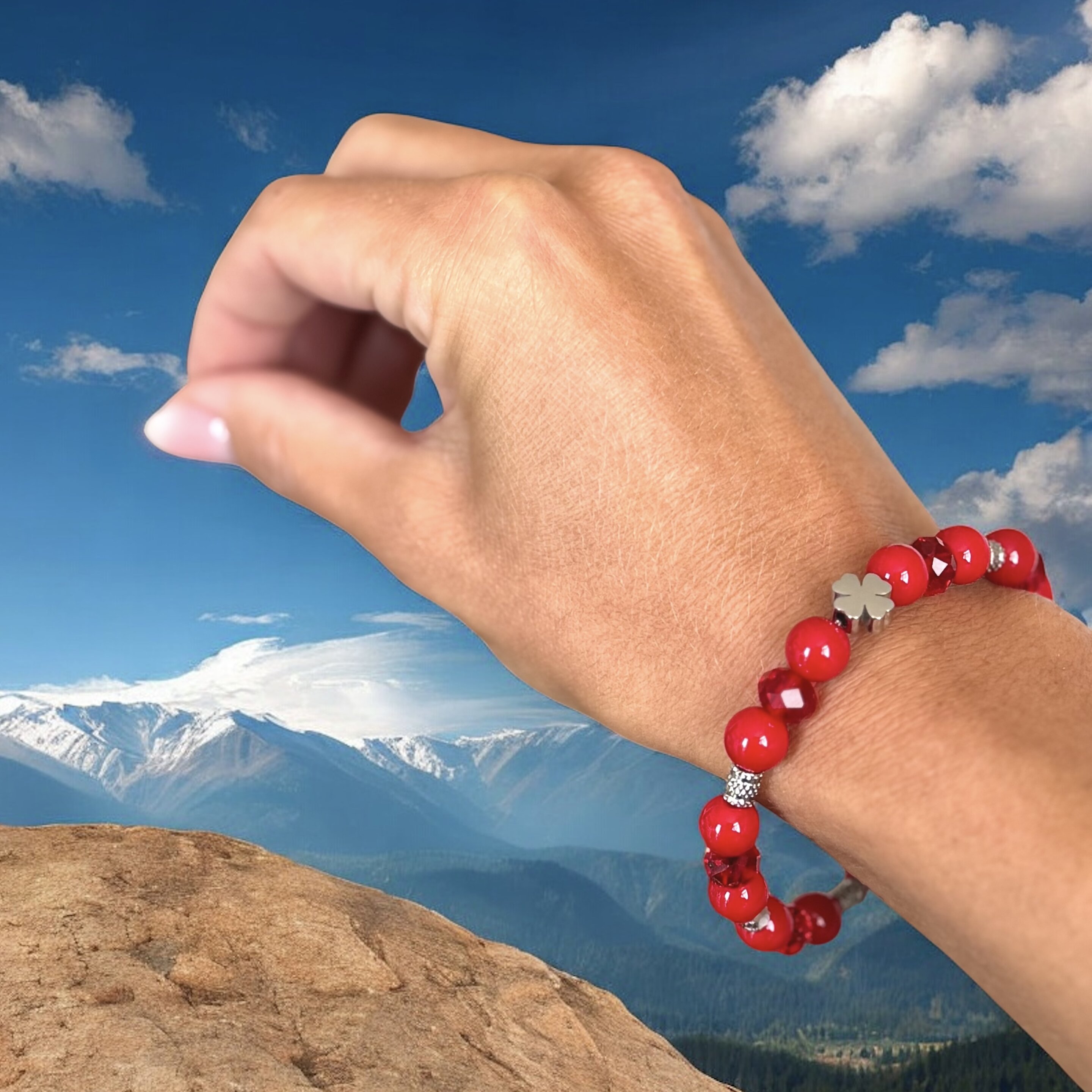 Náramok so štvorlístkom pre šťastie. Náramok je vyrobený z prírodných kameňov červeného Koralu v kombinácii s červenými brúsenými kamienkami doplnený striebornými prstencami a guličkami s povrchovou úpravou silver filled vďaka čomu nestratia farbu, sú odolné a vhodné aj pre alergikov